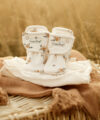 Capáčky mají hřejivou podšívku, která udržuje malé nožičky v teple. Snadno se nazouvají díky zapínání na suchý zip a patent. Všitá gumička kolem celého obvodu zajistí správné místo na nožičce a přesto netlačí. Fleecové capáčky šijeme ve čtyřech velikostech. Od novorozenců po batolata a jejich první krůčky. V capáčkách s moderním designem uděláte parádu nejen ve městě. Na výletě, v kočárku, nosítku nebo autosedačce oceníte především jejich funkčnost.